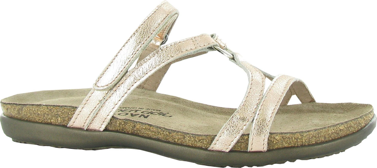 Englin’s Fine Footwear presents the women’s ‘Carmen’ from Naot. The Carmen is a feminine strappy slide with a metal ring hardware. A hook & loop at the instep, provides perfect adjustability. Naot’s anatomic cork & latex footbed is wrapped in a pampering suede and molds to the shape of the foot with wear. The Flat Elegant Collection features a .75″ TPR sole.