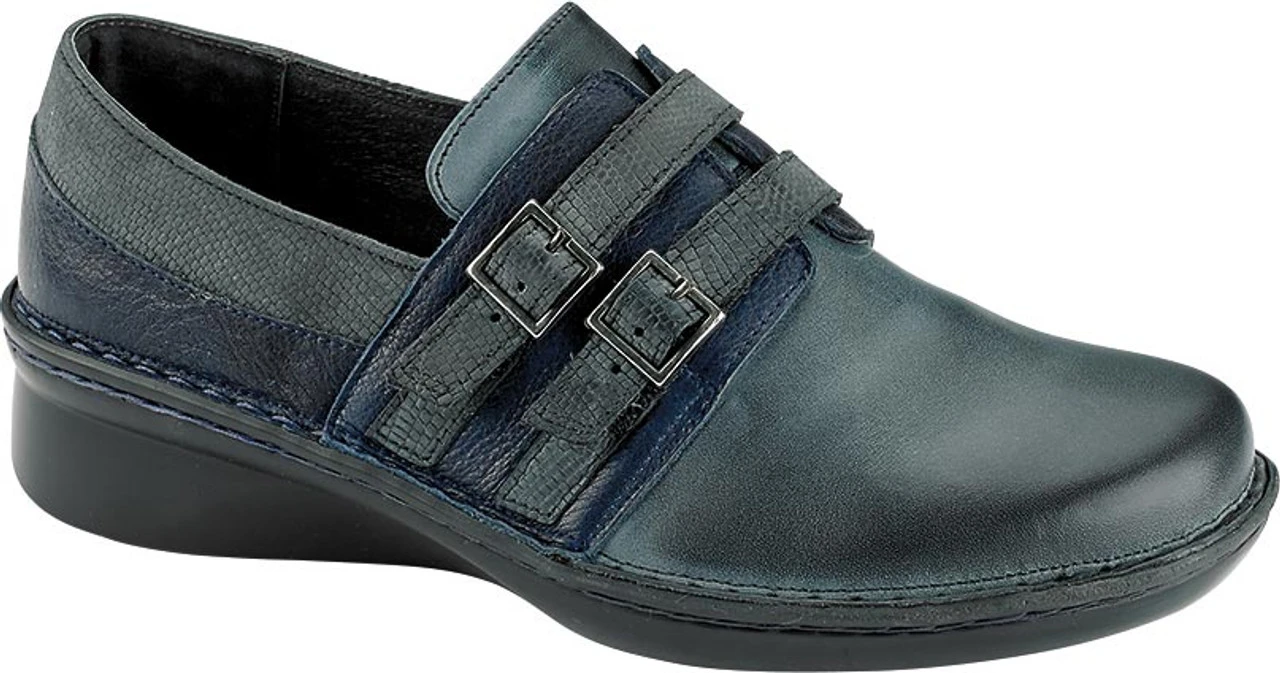 Englin’s Fine Footwear presents the women’s ‘Celesta’ from Naot. The Naot Celesta is a flat shoe with contrasting leathers and faux buckle hook & loop straps. This style has a slightly wider fit and features a padded heel cup and padded tongue for ultimate comfort. This shoe has padded technical lining for comfort, warmth & moisture absorption. Naot’s removable, anatomic cork & latex footbed is wrapped in pampering suede and molds to the shape of the foot with wear. The Allegro Collection features a 1.5″ polyurethane sole which is extremely lightweight and durable.