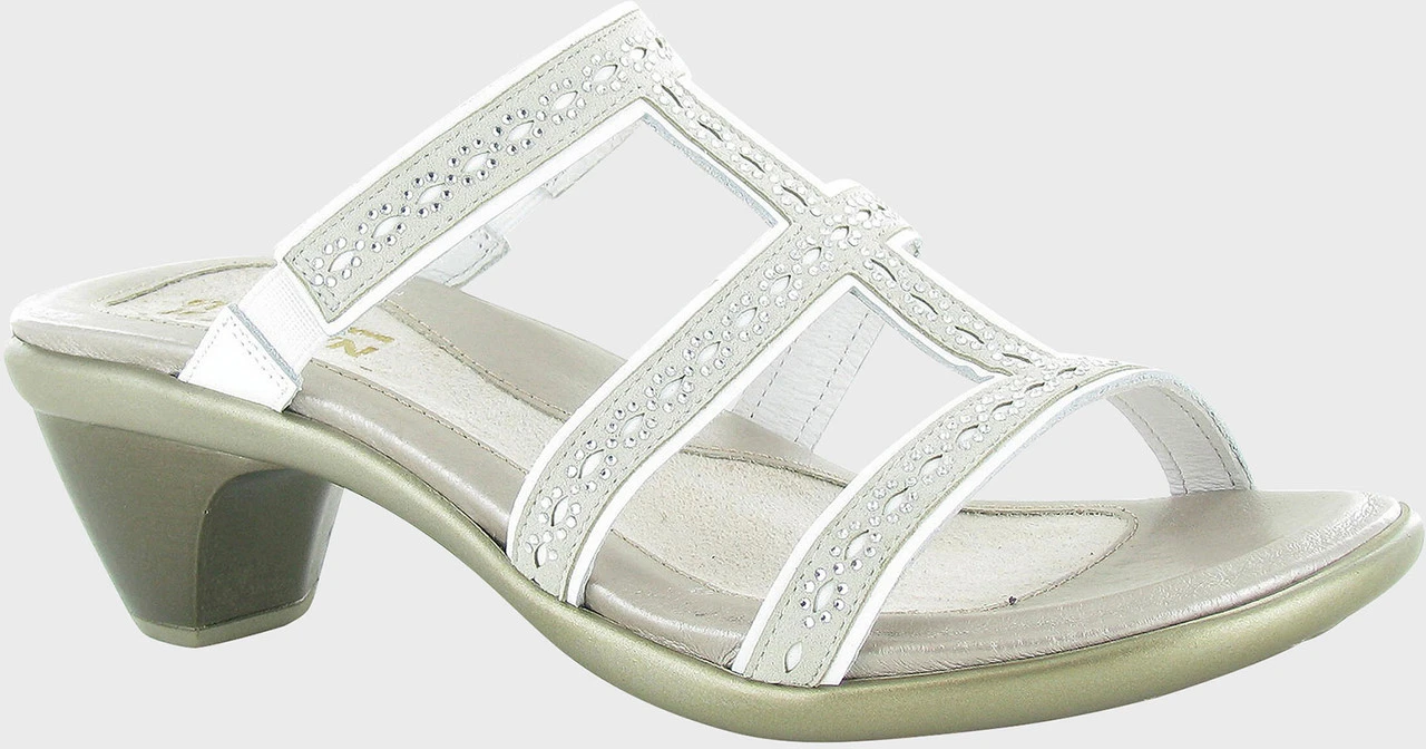 Englin’s Fine Footwear presents the women’s ‘Novel’ from Naot. Meet the Novel, a dressy slide sandal that offers style and comfort. The Novel has double gore for ease of wear and beautiful stone accents. Naot’s anatomic cork & latex footbed is wrapped in leather with a microfiber center to prevent slipping and molds to the shape of the foot with wear. The Avant-garde Collection features a TPR sole with a metal shank. This sole offers the look of a 2″ heel without the feel.